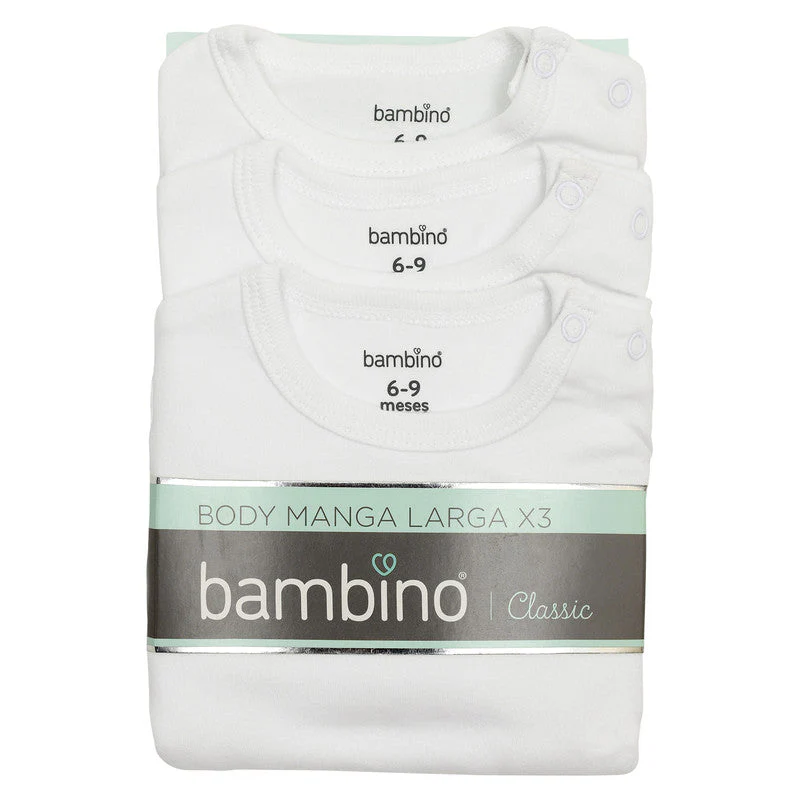 Un básico que no puede faltar en la vida de tu bebé, son los Body Blancos Manga larga de Bambino, 100% algodón, su tela es gruesa para mantenerlo siempre calentito. El set incluye 3 unidades.